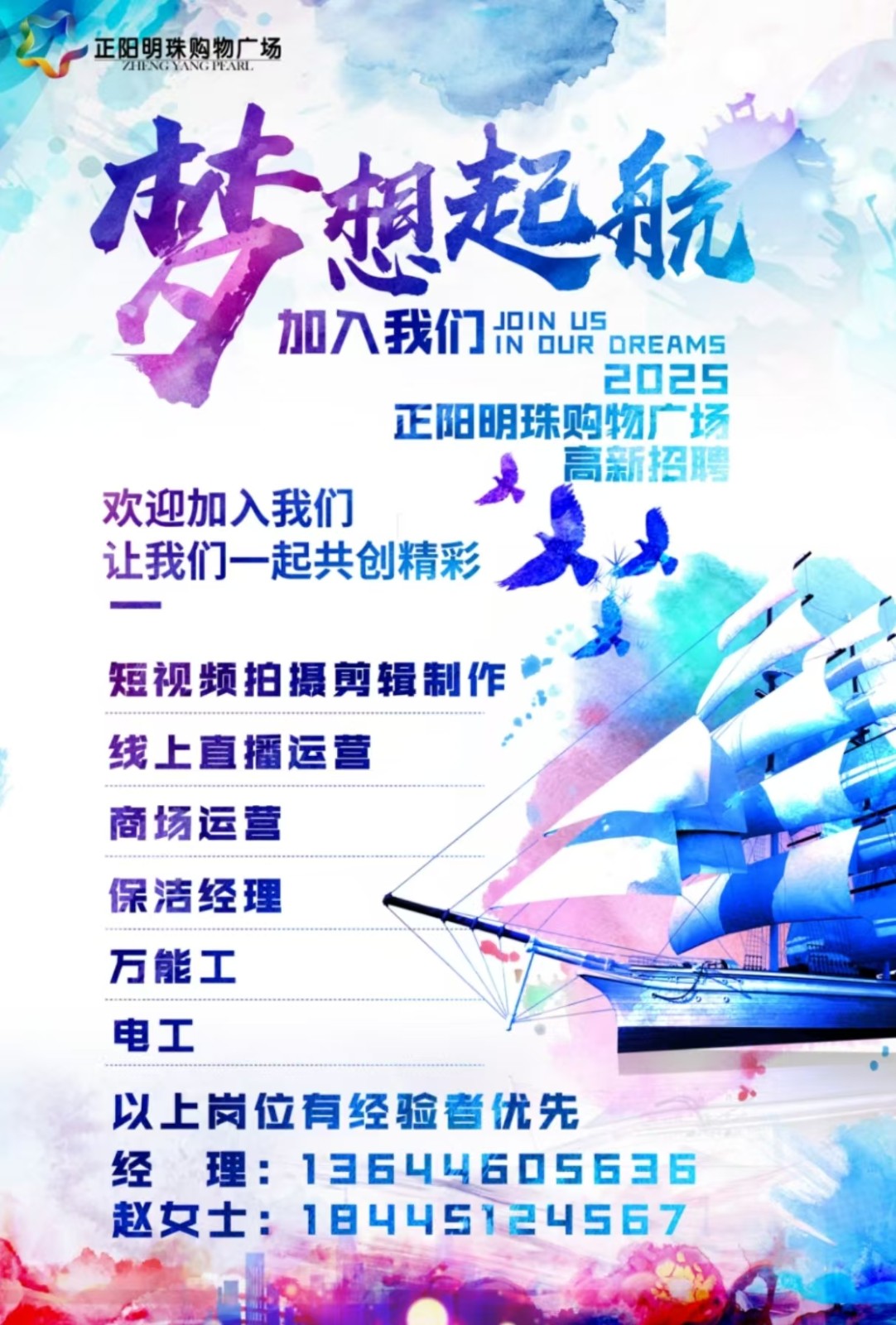 一、電工、萬能工、線上直播運營、短視頻拍攝剪輯制作、保潔經理、商場運營有商場從業(yè)經歷。