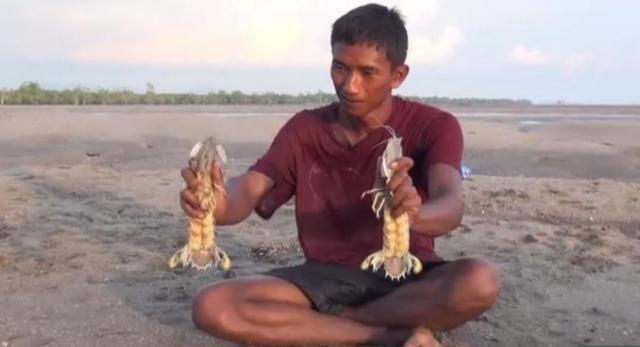 他小伙也不甘落后,紛紛跟著來(lái)捉蝦,圖中是一個(gè)小伙的成果! 瀨尿蝦也叫螳螂蝦。沒想到這種蝦不是和其他蝦一樣生活在海底,而是生活在海灘的泥洞里,他們常在淺海沙底或泥沙底掘穴,穴多為「U」字形。